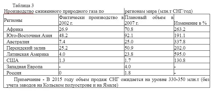 Как видно из таблицы 3, производство сжиженного газа, еще в 1995 г. составлявшее менее 10 млн тонн, уже в 2002 г. превысило 100 млн тонн и в 2010 г. около 270 млн тонн. То есть в настоящее время сжижается почти 15% мировой добычи СНГ, что составляет около 40% всего экспорта. Необходимо иметь в виду, что почти 90% этой продукции потребляется странами Азиатско-Тихоокеанского региона, в первую очередь Японией и Южной Кореей. Североамериканский и Европейский рынки только начинают осваивать сжиженный газ.