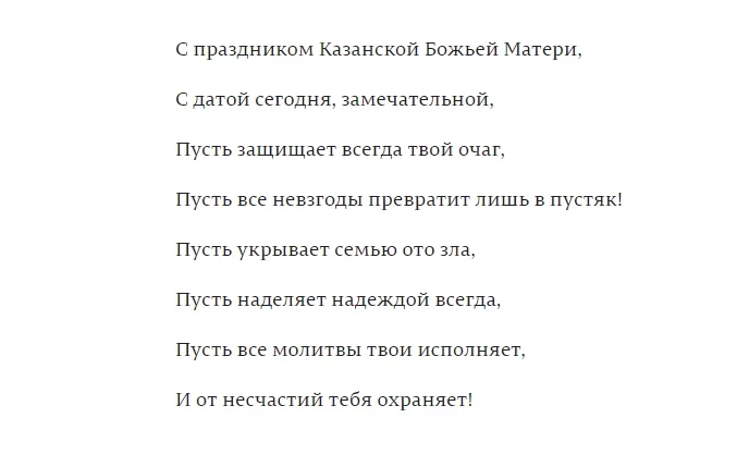 Мы можем пожелать друг другу света и тепла в сердце, как на иконе Казанской Матери. Можем пожелать, чтобы наша вера всегда была крепкой, как стены святыни. Можем поздравить близких словами благодарности за их поддержку и доброту, какую они приносят в нашу жизнь.