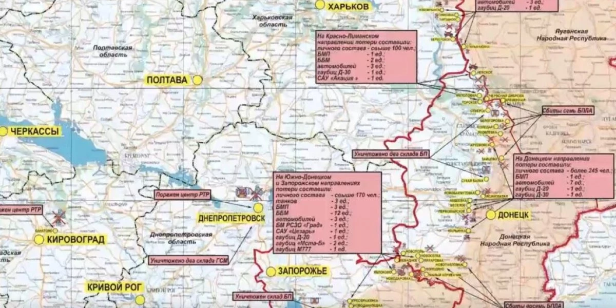 Общие потери противника на данных направлениях за сутки составили свыше 170-ти украинских военнослужащих, три танка, три боевые машины пехоты, 12 боевых бронированных машин и три автомобиля. Также уничтожены: боевая машина РСЗО «Град, самоходная артиллерийская установка «Cezar производства Франции, артиллерийская система М777 производства США, две гаубицы «Мста-Б и одна Д-20.