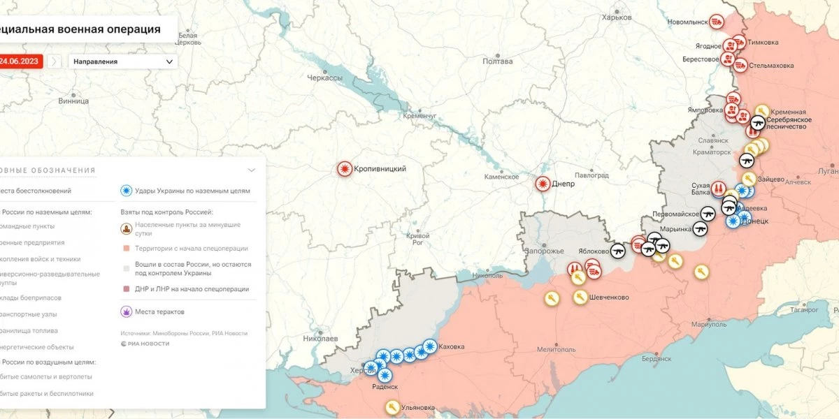 Карта боевых действий на Украине, к утру 25 июня 2023г., от РИА Новости