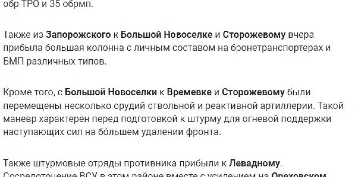 Запорожское направление: в районе Пятихаток идут ожесточенные бои. На Ореховском участке враг не предпринимал активных действий, российские бойцы крепко держат свои позиции. На Времьевском выступе продолжаются бои при активной работе артиллерии.
