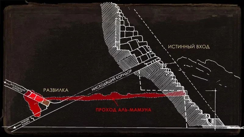 В Каире Халиф аль-Мамун провёл 47 дней, причём всё это время трудился не покладая рук. То есть руками-то он, понятно, не работал, а указывал, что и как делать. В 820 году он пригнал к пирамиде Хуфу множество людей, начиная с инженеров и заканчивая каменотёсами, и повелел им отыскать вход в пирамиду. Искали они его искали, да так и не нашли. И тогда аль-Мамун, как считают, приказал разводить на поверхности каменной облицовки пирамиды костры, а раскалившийся известняк поливать винным уксусом, отчего тот трескался и крошился. Затем пирамиду долбили таранами. И вот так, шаг за шагом рабочие халифа начали углубляться в пирамиду и сумели пробить в ней практически 30-метровый туннель. И пробились-таки в узкий ход, по которому и пошли, «преодолевая тьму, которая страшила взоры и была труднодоступна для прохождения. Ширина хода была немногим больше метра, да и высота такая же, а ещё он шёл вниз под углом в 26 градусов. Пришлось двигаться по нему на четвереньках, причём вместе с рабочими в этот ход полез и сам аль-Мамун. По «Нисходящему коридору (он теперь так и называется) они спустились до конца и оказались в «яме, полной обломками камней и пыли. Судя по копоти от факелов, тут кто-то уже побывал до них, очевидно, что ещё в античные времена.
