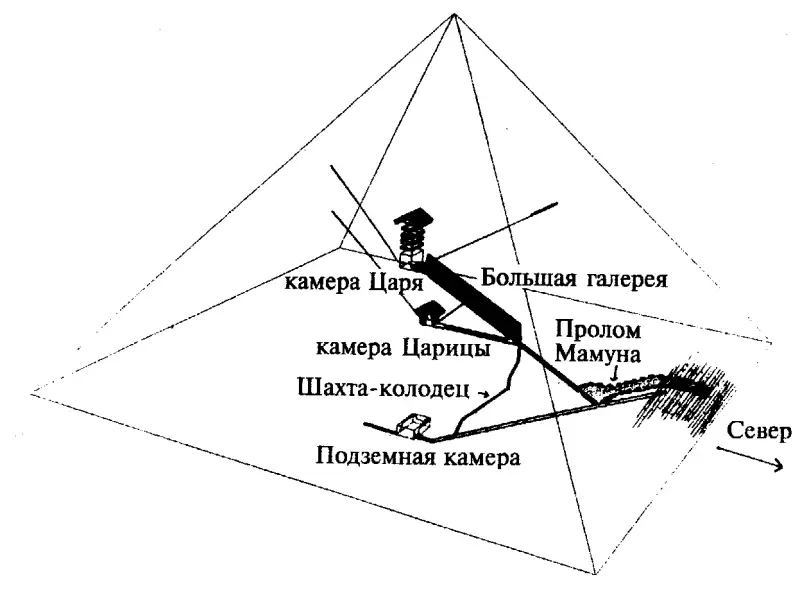 Схема внутренних галерей пирамиды Хуфу вместе с проходом аль-Мамуна