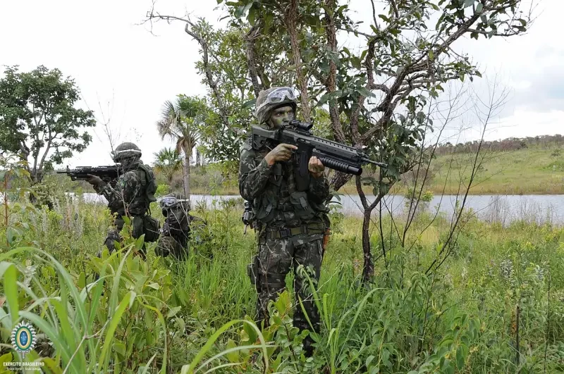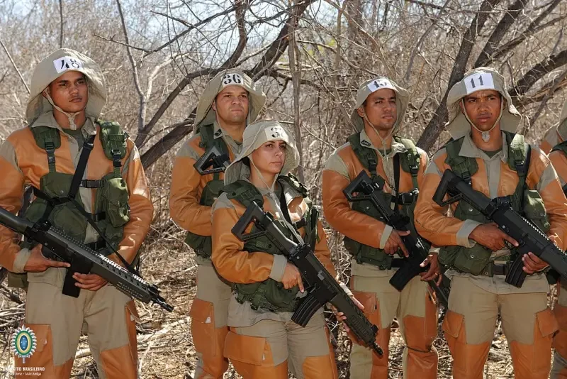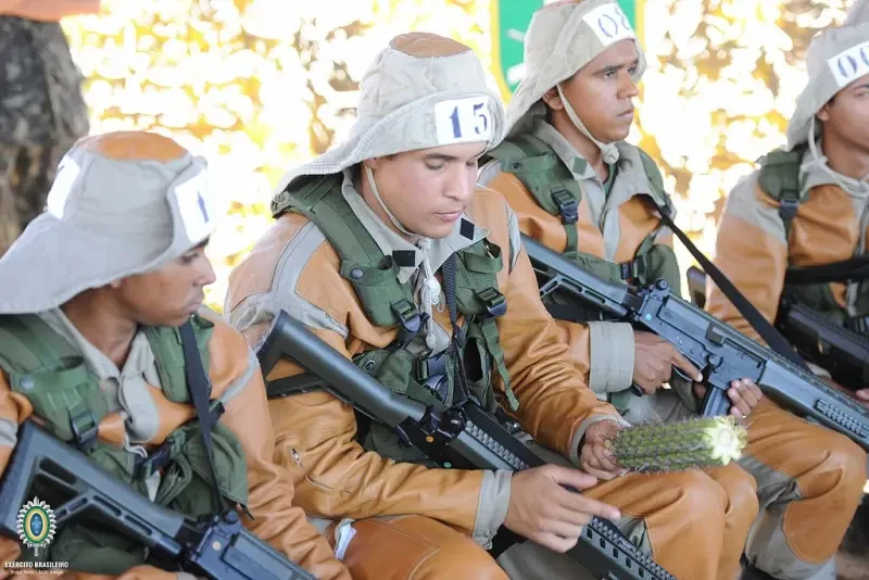 «Combatente da Caatinga — бразильское спецподразделение для действий в засушливом районе Каатинга, который является уникальным для Бразилии. Каатинга — это очень негостеприимная среда в северо-восточном регионе страны, полная колючих растений и ядовитых тварей, при очень незначительном количестве воды. Военная подготовка специальных подразделений, способных действовать в этой оперативной среде, означает, что Бразилия имеет возможность отправить свои войска в любой регион с похожим климатом. На данном фото боец подразделения Каатинга с автоматом «IMBEL IA2. Фотография министерства обороны Бразилии