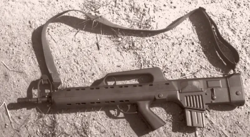 Магазины используются секторные, от американской винтовки М16 на 20 и 30 патронов. Причём, поскольку эта винтовка «буллпап, вставляются они под руку в гнездо в прикладе. Защёлка отсоединения магазина находится позади него, что не очень удобно. Как и на американской М16, окно для выброса стреляных гильз снабжено подпружиненной крышкой, которая открывается при взведении затвора и стрельбе. Наличие её повышает пыле-грязезащищённость винтовки. Окно для выброса имеет самую прогрессивную конструкцию и может находиться как с правой, так и с левой стороны. Есть у неё и штык-нож, но вряд ли можно рассматривать такое компактное оружие в качестве мощного штыкового…