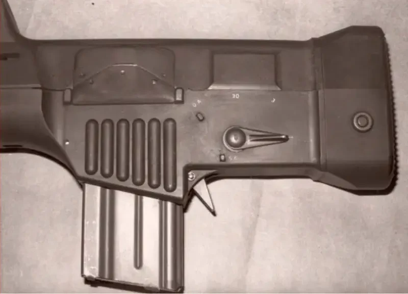 Флажок-переводчик режима огня находится слева между затыльником приклада и шахтой магазина и имеет три режима огня – «1, «3, «30, а ещё две установки УСМ – «DA и «SA. Положение «1 – огонь одиночными выстрелами, «3 – очереди по три выстрела, «30 – непрерывный огонь. Когда огонь открывается сразу, флажок находится в положении «SA (одинарного действия), при этом усилие на спусковом крючке будет небольшим, а его ход – коротким, чем повышается точность огня. В положение «DA (двойное действие, самовзвод) флажок ставят, если из винтовки какое-то время огонь вести не планируется, но готовность у неё к бою нужна постоянная.