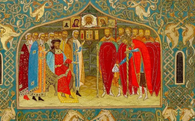 Прибытие Гландо Камбилы в Новгород. Миниатюра из «Летописного и Лицевого Изборника Дома Романовых 1913 года