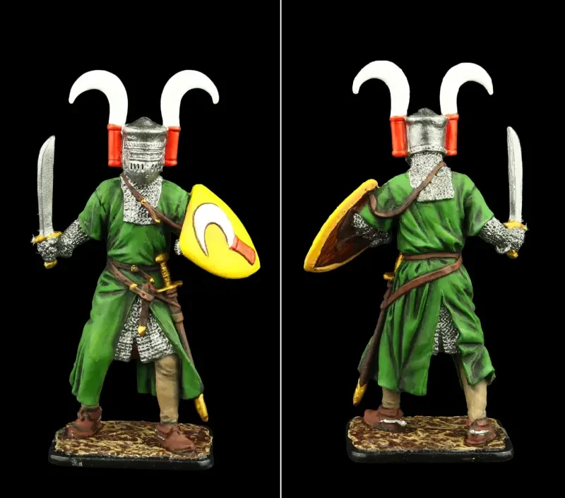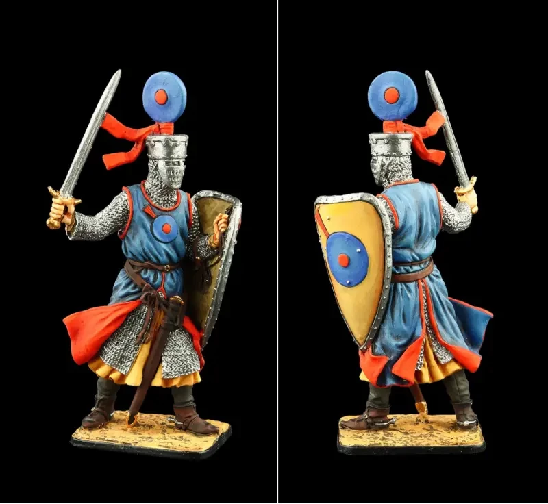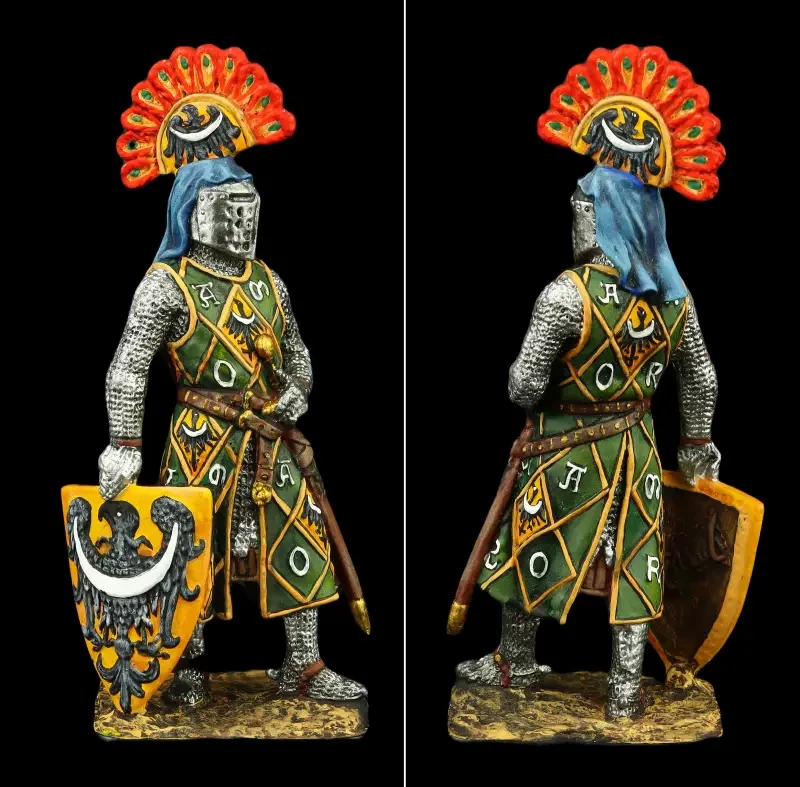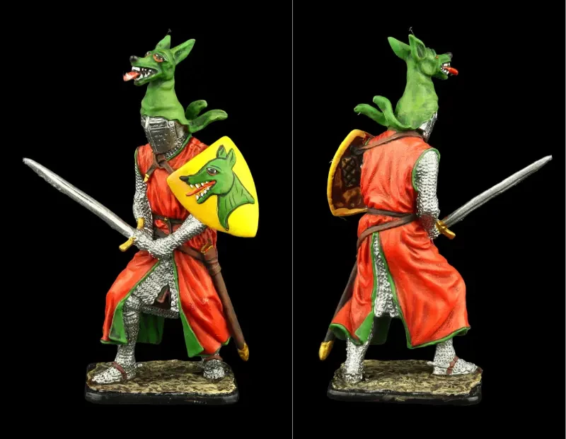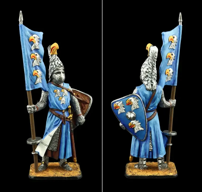 Рыцарь-миннезингер Генрих фон Теттинген. Интересно, что вооружён он фальшионом (фелсеном), а меч висит на поясе. Очень оригинальны и его нашлемные украшения – два серпа и такой серп, то есть гербовое изображение серпа на щите. Всё это лишний раз говорит о том, что символы земледельческого труда никуда из рыцарского обихода не ушли, а сам труд земледельца был в достаточной степени почитаем. О чём, кстати, у нас на Руси свидетельствует былина о Вольге и Микуле Селяниновиче. Только у нас об этом говорилось вслух, а на Западе демонстрировалось на уровне символов. Фигурка ЕК Castings и Silver Dream Studio