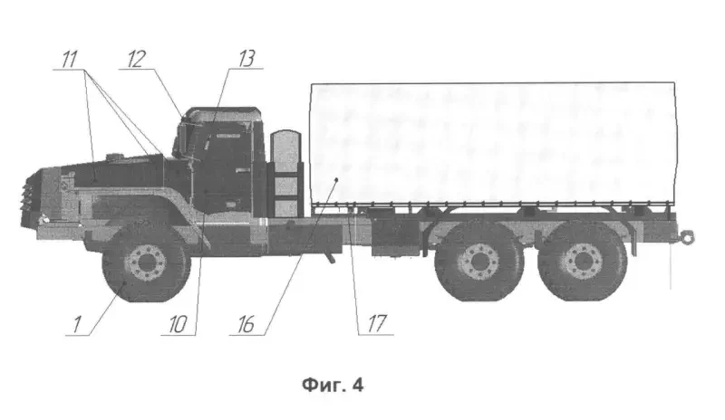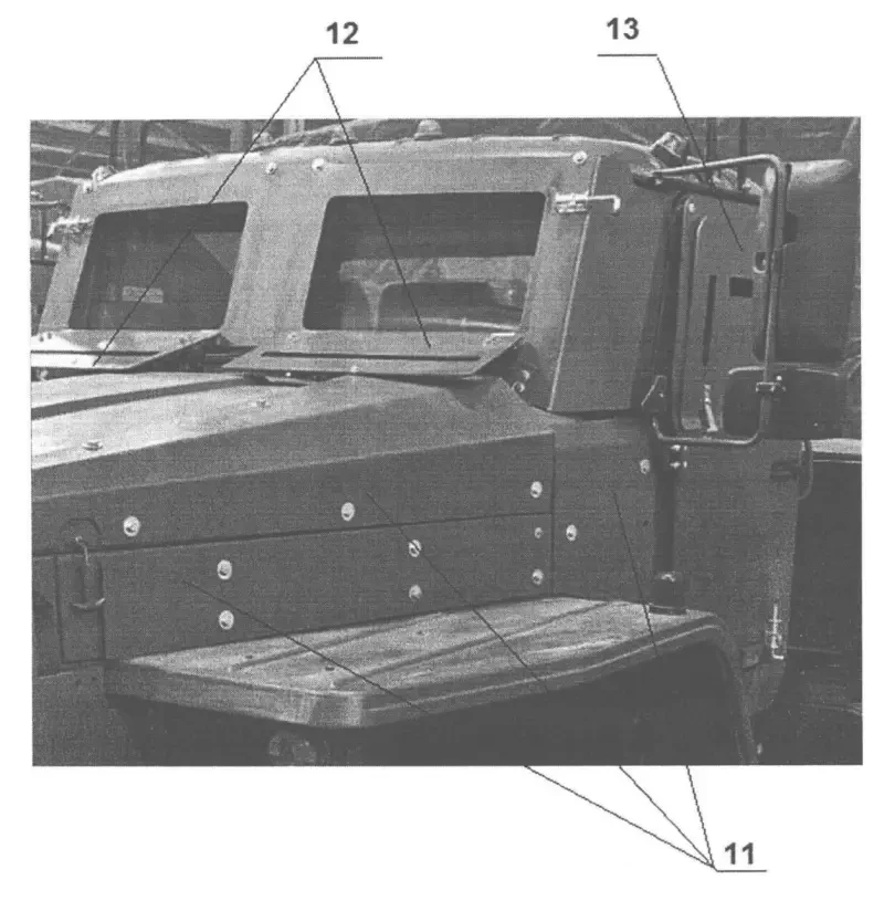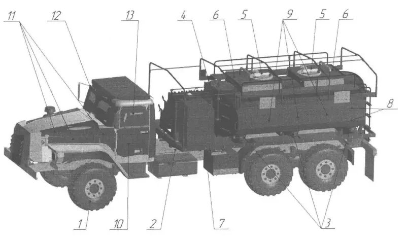 «Цистерна для горючего и технологическое оборудование установлены и жестко зафиксированы внутри бронированного корпуса российской бронированной машины на базе тяжелой универсальной гусеничной платформы Т-15 «Армата». Особенность бронирования данного топливозаправщика заключается в расположении экипажа с органами управления в изолированной бронекапсуле, отделенной от остальной части бронированной переборкой. Отсек моторно-трансмиссионного отделения также отделен бронированной переборкой от технологического оборудования. Предположительно, это делает бронированный топливозаправщик необычайно живучим даже в случае множественных повреждений брони. Броня с керамическими вставками поглощает энергию снаряда за счет разрушения керамического элемента и на перемещение остальных керамических элементов в плоскости брони, что приводит к преобразованию осевого ударного импульса в импульс в плоскости брони.»