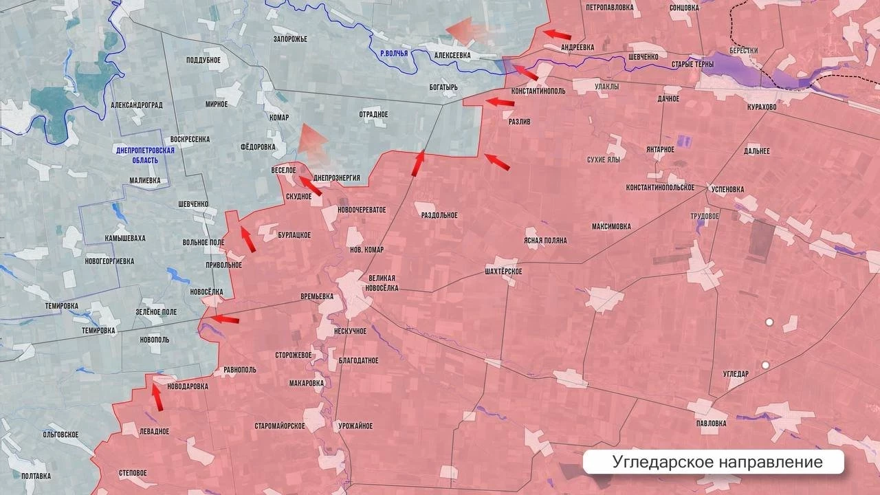 На Угледарском направлении основные бои в районе Богатыря. ВС РФ укрепляются на занятых ранее позициях вблизи восточной и южной окраинах села. Противник контратакует, но несёт тяжёлые потери. Наши ДРГ периодически проникают на окраины села, но не закрепляются. В районе Отрадного и Фёдоровки ВСУ также контратакуют вплоть до Днепроэнергии. Как и у Богатыря - без какого-либо результата. В районе Алексеевки тяжёлые бои, противник крепко держит рубежи.
