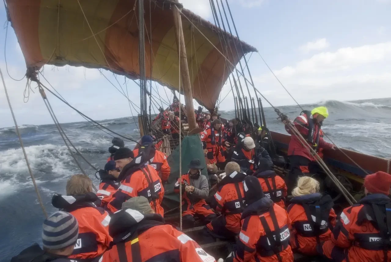 Современная реконструкция корабля викингов средних размеров. В комментах под предыдущей статьей было обсуждение про способность драккара идти под ветром. Этот кораблик, как видно, идет крутым бейдевиндом.