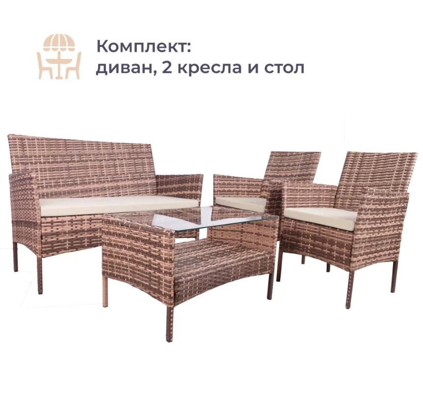 Когда вы решаете, как выбрать удобную мебель для балкона, важно учитывать не только стиль, но и практичность — и комплект Homsly в цвете «кофе с молоком» полностью отвечает этим требованиям. В набор входят диван, два кресла и столик со стеклянной столешницей — всё устойчиво к влаге, солнцу и повседневной нагрузке. Искусственный ротанг не требует ухода, а мягкие подушки с водоотталкивающей пропиткой обеспечивают максимальный комфорт. Надёжный стальной каркас выдерживает вес, а сборка не вызывает трудностей — всё поставляется в одной коробке.