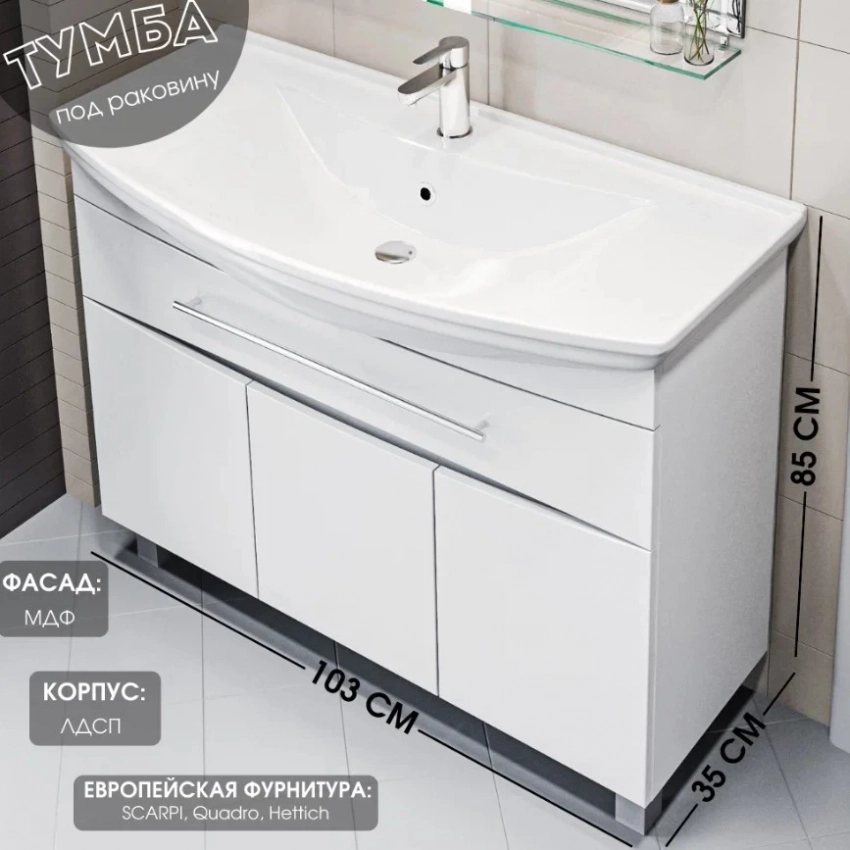 Тумба под раковину Lina New 105Н от 1Marka — отличный пример того, как выбрать качественную мебель для ванной комнаты, если вы цените комфорт, эстетику и немецкую надёжность. Фасады из МДФ EGGER с влагостойкой ПВХ-плёнкой устойчивы к влаге и при этом выглядят дорого. Немецкая фурнитура Hettich обеспечивает плавное и тихое закрытие, а корзина для белья и глубокие секции с доводчиками делают хранение удобным. Функциональные ручки могут использоваться как полотенцедержатели, что добавляет ещё один плюс к универсальности этой тумбы.