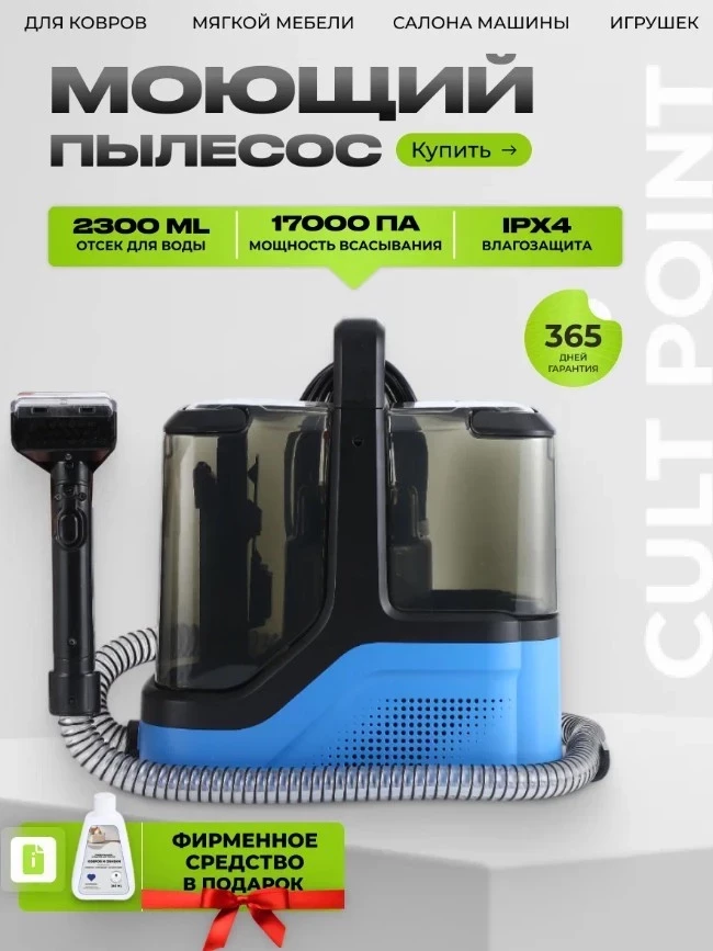 Cult Point уверенно занимает позиции в списке «моющий пылесос для химчистки мебели рейтинг», предлагая пользователю удобство, мощность и тихую работу. Благодаря аквафильтру, самоочистке и двум насадкам, пылесос эффективно справляется с влажной уборкой мебели и ковров, не оставляя разводов и пятен. Сбор жидкостей, бесшумная работа на 70 дБ, лёгкий вес в 3,8 кг и современный дизайн делают его удачным выбором для тех, кто ценит чистоту и комфорт при минимуме усилий.