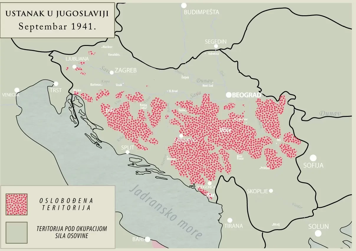 25 марта 1941 года регент Павел подписал протокол о присоединении Югославии к Тройственному пакту и уже через два дня был отстранен от власти офицерами во главе с генералом Симоновичем. Армии Германии и союзников Рейха атаковали Югославию и за несколько дней (с 6 по 11 апреля 1941 г.) разгромили ее войска. Сербы и черногорцы начали партизанскую войну, посмотрите, какую территорию контролировали их отряды в сентябре 1941 года: