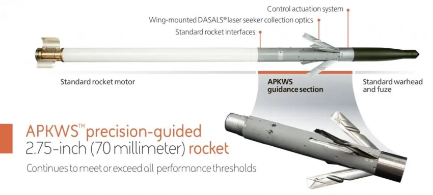Двухрежимная ГСН для НУРС калибра 70-мм APKWSII с инфракрасным и лазерным наведением обеспечивает истребителям улучшенные возможности противодействия беспилотным летательным аппаратам, которым поручено эффективно и недорого отражать атаки беспилотников.