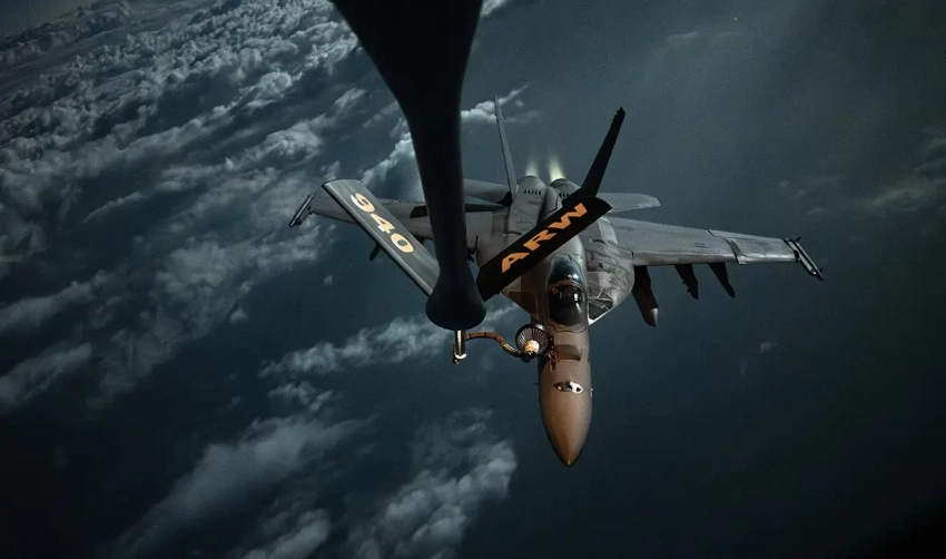 Истребитель ВМС США F/A-18 Super Hornet заправляется над зоной ответственности Центрального командования ВВС США, 16 марта 2025 года. Super Hornet направляется в зону операций 5-го флота США для поддержки морской безопасности и стабильности в регионе Ближнего Востока