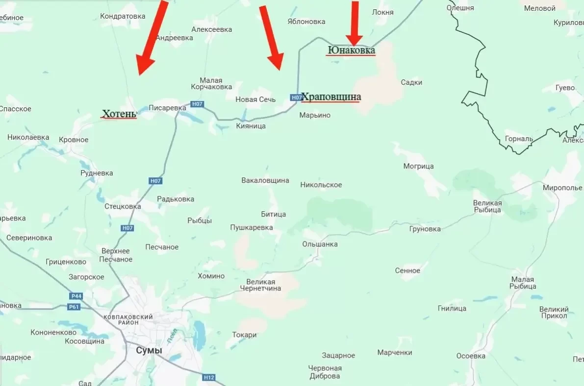 Кроме того, подразделения группировки войск «Север» нанесли поражение скоплениям живой силы и техники ВСУ в районах населенных пунктов Хотень и Храповщина. ВС России продвигаются в направлении последнего, находящегося в 16-17 километрах от областного центра - города Сумы.