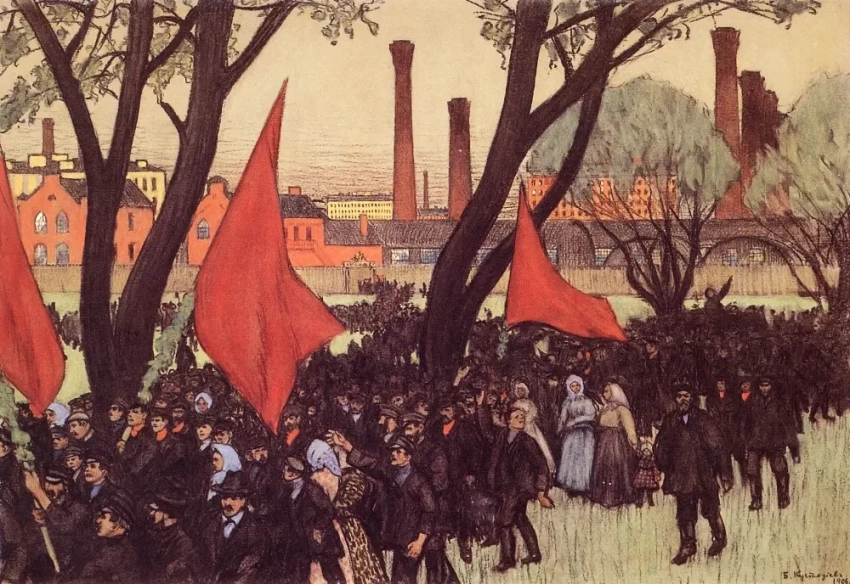 Б. Кустодиев. Первомайская демонстрация у Путиловского завода. 1906 г.