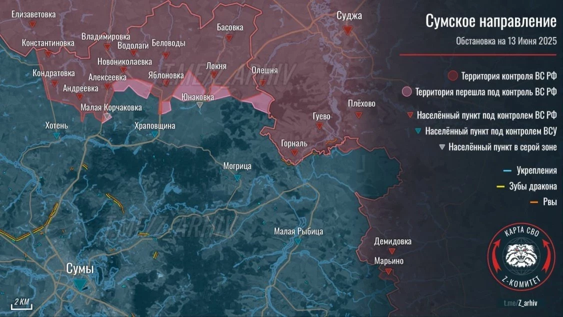 «Сама по себе Сумская область является весьма небольшой, самая большая, к слову, Днепропетровская. Но тем не менее наши успешные действия там говорят о том, что у противника нет возможностей, средств сдерживать наши действия и остановить продвижение на Сумы, несмотря на то что там были проведены серьезные фортификационные мероприятия. Например, очень хорошо было проведено минирование. Но даже несмотря на это, я вижу, что Сумы для противника будут обречены, они станут нашими. И да, это выход на Харьков»,
