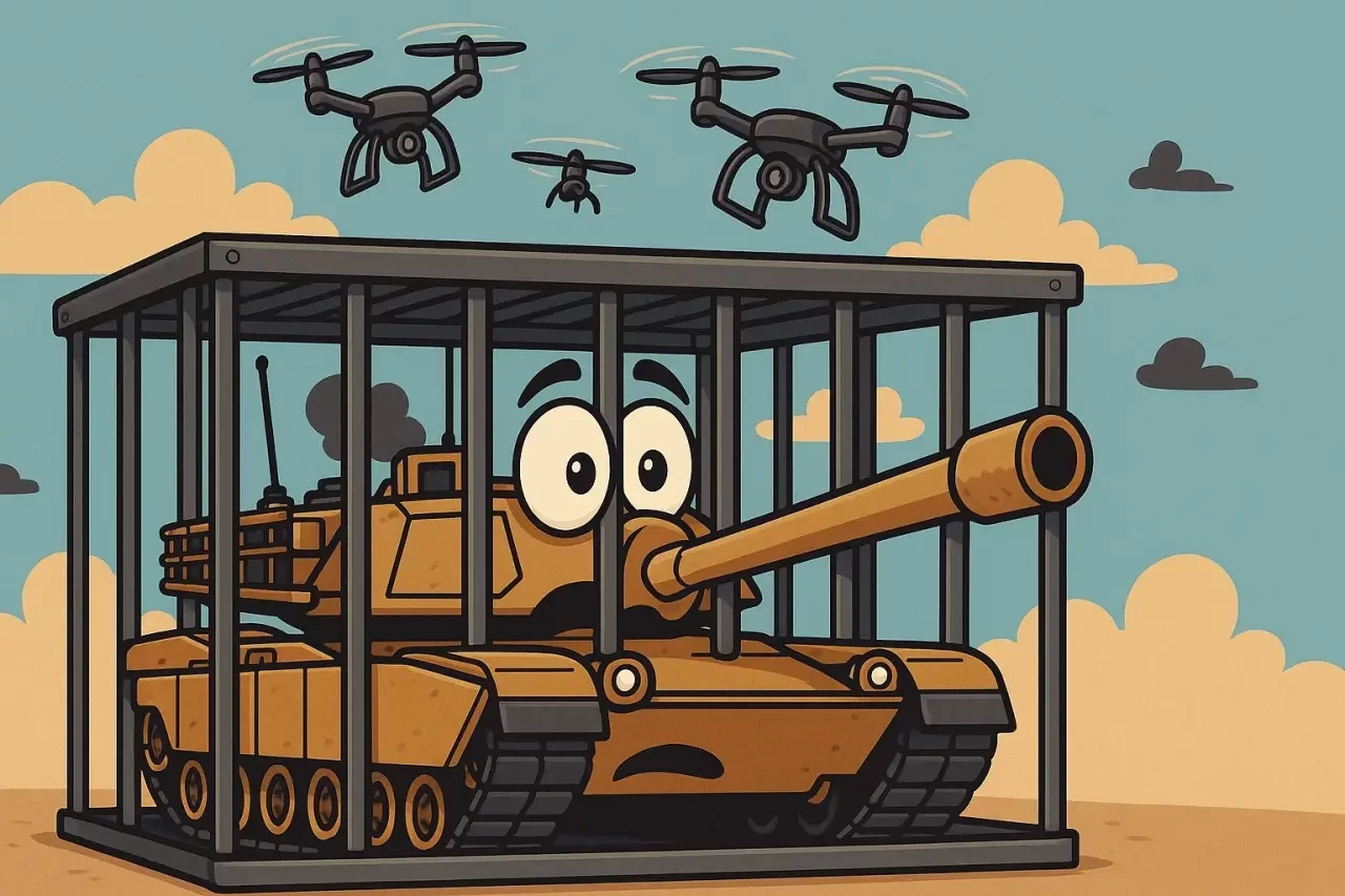 Как именно всё это будет выглядеть — пока не понятно. Но есть некоторые сомнения, что речь идёт о броневых модулях, устанавливаемых вплотную к броне крыши — это и массу значительно увеличивает, да и габариты блоков будут таковыми, что перекроют значительную часть зоны видимости через прицелы и приборы наблюдения. Поэтому, скорее всего, мы увидим некое подобие «мангалов», возможно, в сочетании с динамической защитой. Тем более, что опыт «омангаливания» разномастной техники, включая «Абрамсы» и «Брэдли», за годы СВО уже имеется.