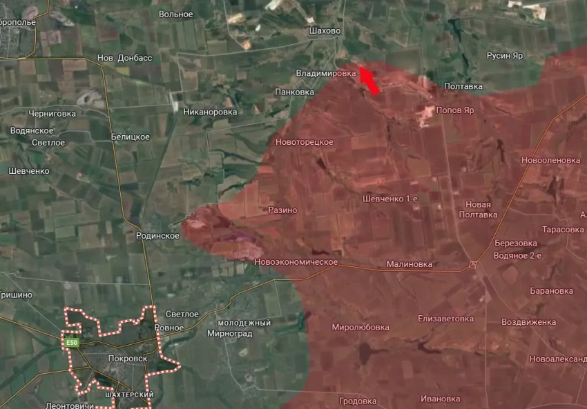 Подход к Владимировке означает расширение ВС РФ зоны контроля на кратчайшем маршруте между Покровско-Мирноградской и Славянско-Краматорской агломерациями. Идёт широкое вклинение между этими направлениями.