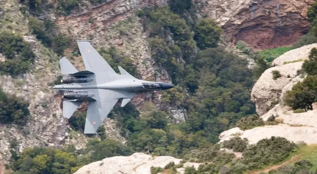 Пролёт Су-30МКИ на сверхмалой высоте через ущелье Вурайкос на Пелопоннесе во время учений Iniochos-25: