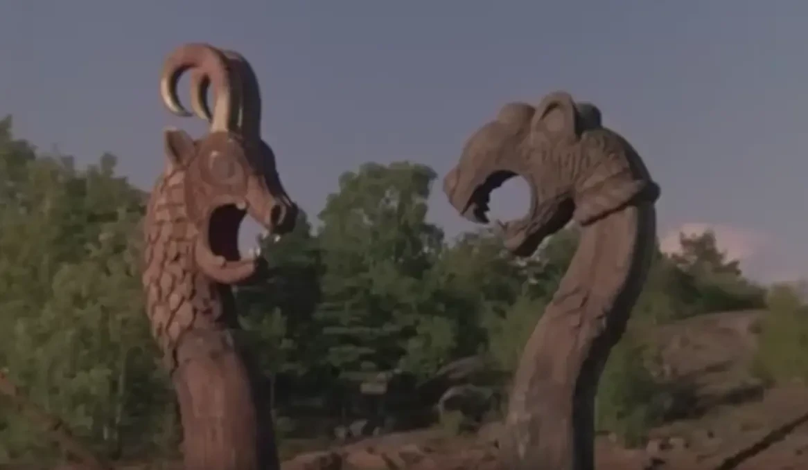 Резные головы драконов из кинофильма «И на камнях растут деревья» (1985). Кадр из фильма