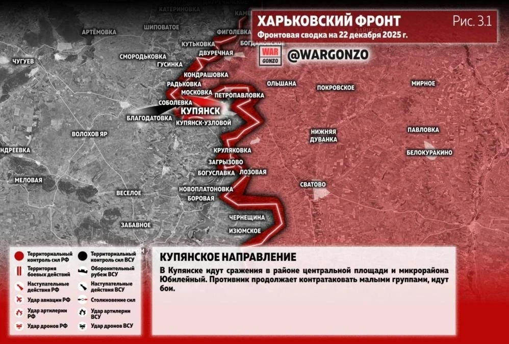 Вооружённые силы Украины (ВСУ) не прекращают предпринимать попытки восстановить хоть частичной контроль над Купянском. Они вводят в бой всё новые и новые резервы, которые методично уничтожаются российскими бойцами, бои при этом ведутся на окраинах города и внутри него. Наш сайт N4k предлагает ознакомиться с последними новостями из зоны проведения СВО, а также публикует свежую карту боевых действий, актуальную на 22.12.2025.