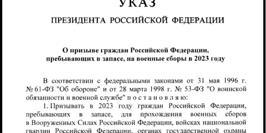 «Постановляю призывать в 2023 году граждан России, пребывающих в запасе, для прохождения военных сборов в Вооруженных силах Российской Федерации, войсках Национальной гвардии Российской Федерации, органах государственной охраны и органах Федеральной службы безопасности, — говорится в тексте.
