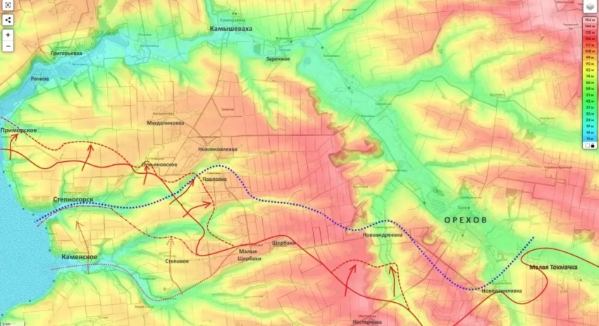По словам эксперта, под контроль РФ практически перешло соседнее Приморское, в котором тоже шли бои. Также серьёзное продвижение фиксируется севернее Степногорска. Кроме того, начался штурм Лукьяновского. Российские военные, прогнозирует Подоляка, в ближайшие дни освободят село. Кроме того, на юго-востоке участка штурмовики зашли в южные окраины Новоандреевки из Нестерянки.