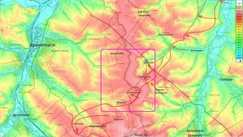 Блогер сообщил, что на краматорском направлении подразделениям РФ удалось выйти к селу Приволье. Согласно сведениям Подоляки, российские военные также завершают зачистку села Миньковка. Блогер спрогнозировал скорое освобождение этого села и последующее продвижение войск РФ к Малиновке.