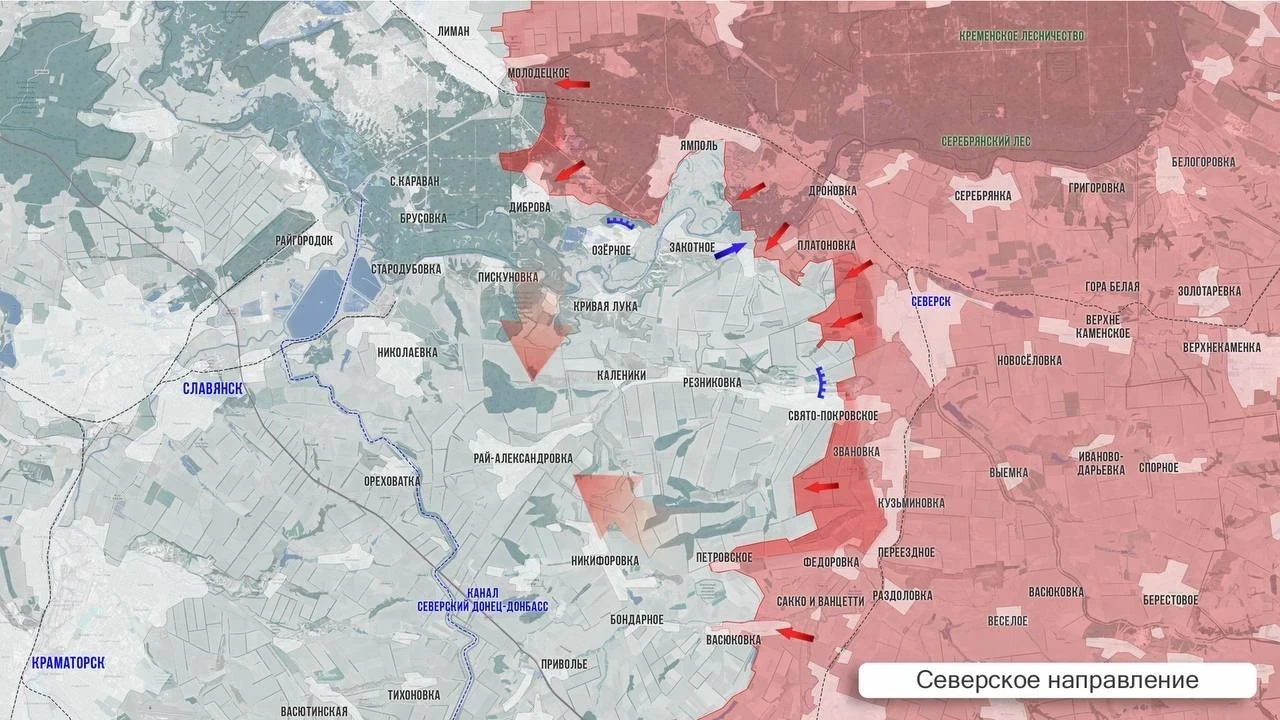 На Северском направлении возросла интенсивность боёв по направлению к Рай-Александровке: сражения идут на участке Хромовка-Бондарное. Армия России освободила Свято-Покровское (Кирово) - село в 3 км к югу от Северска. Контроль над этим селом приближает наступление армии России в сторону Славянска с востока. Ближайшие сёла на этом направлении, остающиеся под ВСУ - Резниковка и Каленики. Идут бои за Закотное, Озёрное и Диброва.