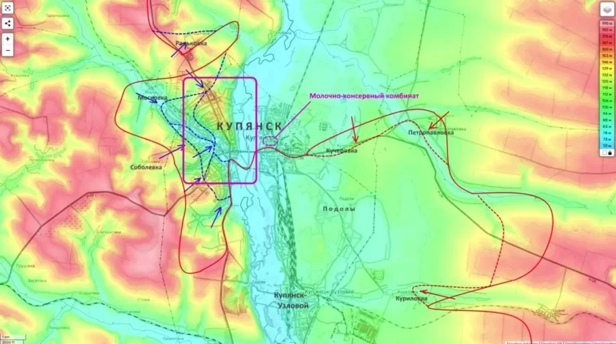 В самом Купянске, на левом берегу Оскола, ситуация оценивается как стабильно-тяжёлая. Наступательный потенциал противника здесь, по мнению обозревателя, исчерпан, и после перегруппировки ВС РФ могут перейти к окончательному вытеснению украинских подразделений из западных и южных районов города.