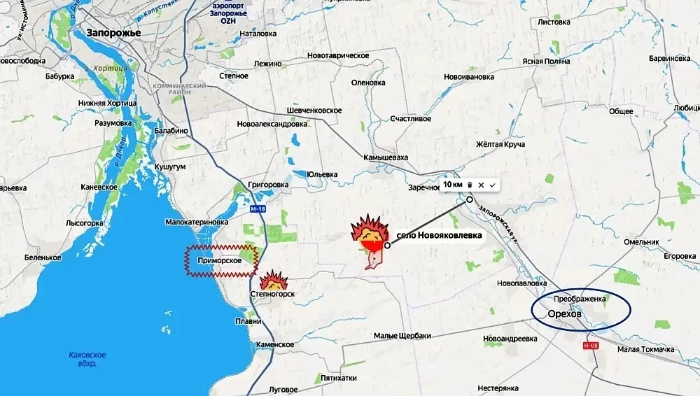 Это наступление более важно тем, что российская армия ведет охват крупного города Орехов с восточного (для гарнизона противника) фланга. От Новояковлевки до важнейшей трассы Н-08 и железной дороги, соединяющих Орехов с Запорожьем, по прямой около десяти километров. Это означает, что снабжение группировки ВСУ в крупнейшем городе на юго-восточных подступах к областному центру Запорожья уже под полным контролем беспилотной авиации и артиллерии ВС РФ, передаёт "Военное обозрение".
