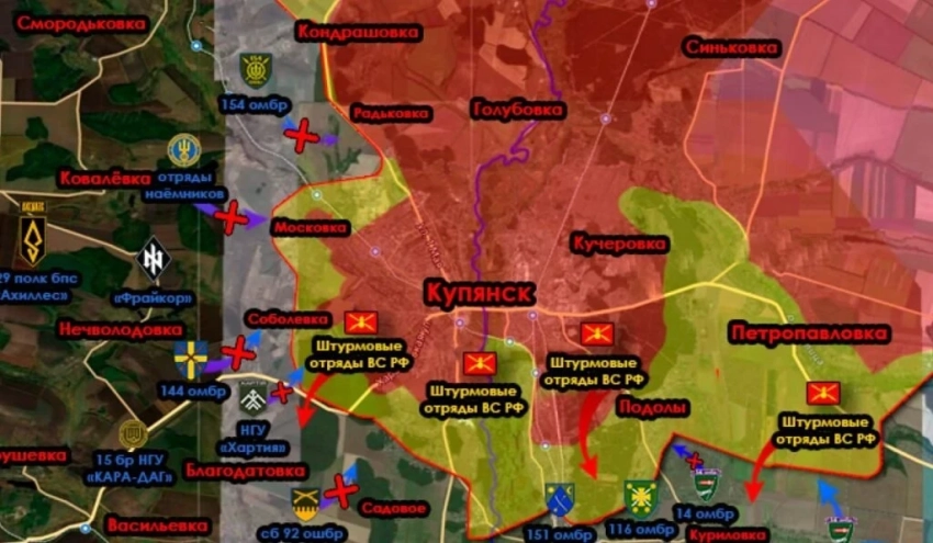 Военный блогер Олег Царёв отметил, что на Купянском направлении, на юго-востоке от взятого под контроль села Подолы, российские войска зашли в Куриловку, взяли северную часть села и продвигаются к его западной окраине вдоль реки Лозовой.