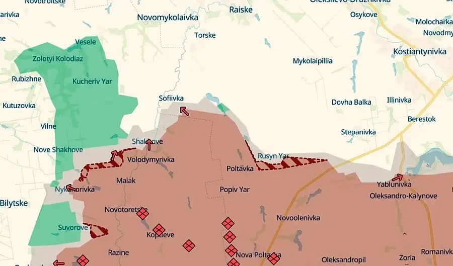 Указано, что ВС России продвинулись возле Русина Яра и Нового Шахово на так называемом выступе юго-восточнее Константиновки. Таким образом, в ходе дальнейшего наступления ВС РФ на этом направлении идет продвижение ВС РФ к Доброполью и продолжается охват Константиновки с южного фланга.