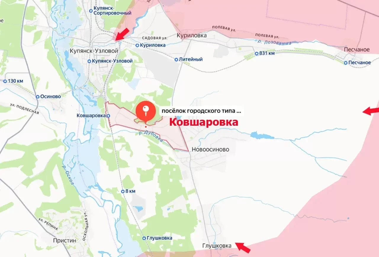 На текущий момент противник потерял контроль над стыком железнодорожных веток в районе переулка Лозовского в Купянске-Узловой. Дальнейшее продвижение ВС РФ способно привести к окружению группировки ВСУ в районе Ковшаровки, что южнее Купянска-Узлового - на левом берегу Оскола.