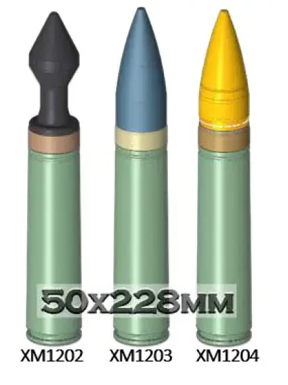 Для XM913 разрабатывается новое семейство унитарных выстрелов типоразмера 50 х 228 мм. Они предназначаются для поражения разных целей и должны демонстрировать большое преимущество перед существующими боеприпасами меньших калибров.