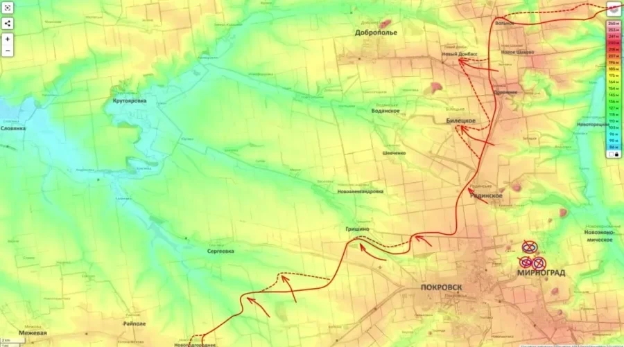 В свою очередь в Донецкой Народной Республике центр боевой активности сместился в район Гришино и Белицкого. Сообщается о продвижении к северу от Красноармейска, где российские подразделения взяли под контроль очистные сооружения. Этот объект рассматривается как важный инженерный узел, контроль над которым позволяет усиливать давление на украинский гарнизон в Гришино.