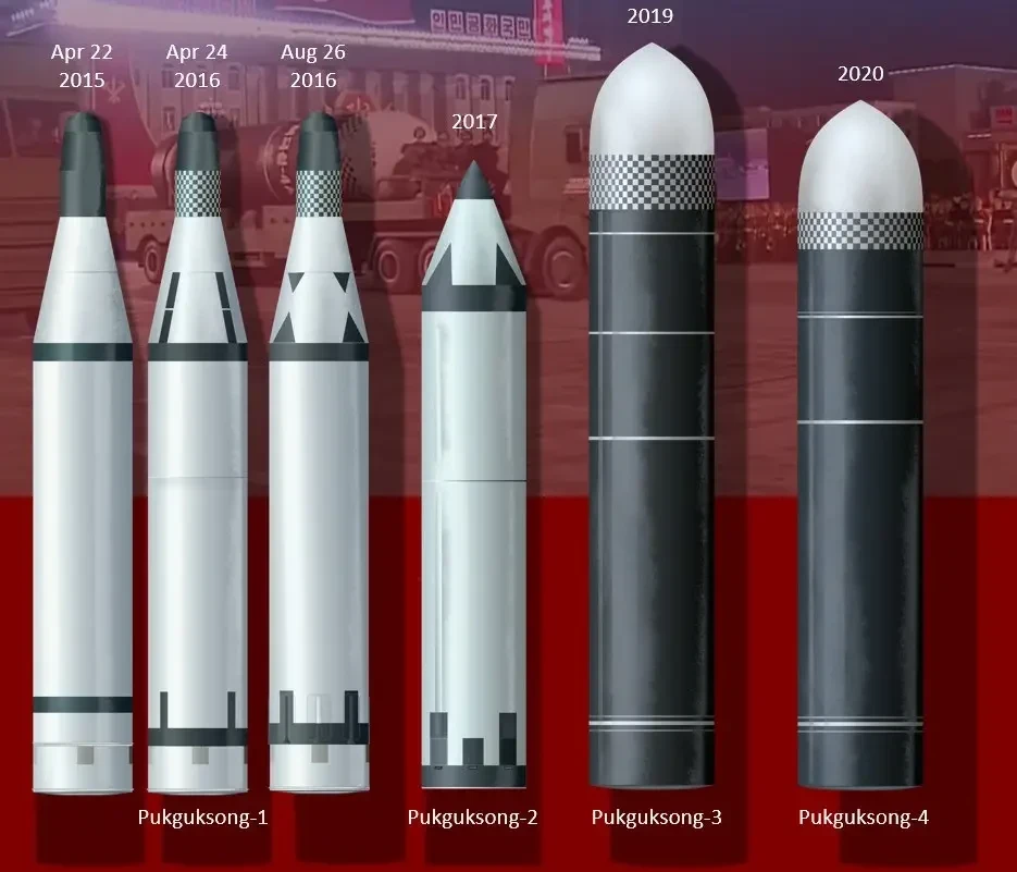 К настоящему времени сообщалось о существовании БРПЛ типов «Pukguksong-1» – «Pukguksong-6», часть этих ракет демонстрировались на парадах в Пхеньяне. Естественно, что власти Народной Кореи не публикуют подробных ТТХ этих изделий, да они и никогда не запускались на полную дальность из-за ограниченных размеров прилегающих морей и близости иностранных территорий. Поэтому дальность приблизительно оценивается по максимальной высоте полета по баллистической траектории и достигнутой при этом дистанции до точки падения.