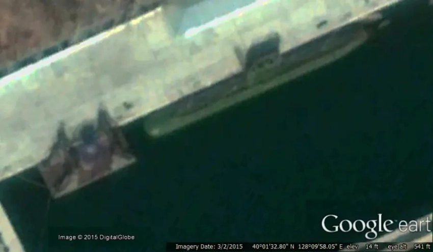 ПЛ «8.24 Yongung» и плавучий ракетный стенд у причала судостроительного завода
