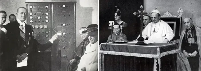 Папа Пий XI (1857–1939), во время первой папской речи по радио в 1931 году. Здесь надо заметить, что Пий XI был первым Папой, который обращался к своей пастве по радио. На фото слева изображен итальянский инженер Гульельмо Джованни Мария Маркони - один из изобретателей радио. Источник: Getty Images
