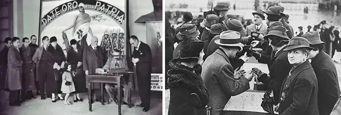18 декабря 1935 года состоялось мероприятие, известное как «День обручального кольца», в ходе которого тысячи итальянцев спонтанно пожертвовали государству свои обручальные кольца и другие ценные вещи, скандируя при этом - «Золото Родине!». Это событие, прошедшее в крупных городах Италии, стало одним из главных символов национализма, характерного для двадцатилетнего фашистского периода. Источник: Getty Images