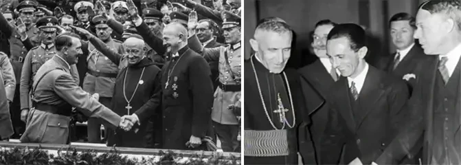На фото справа: подписание Рейхсконкордата 20 июля 1933 года в Риме. Слева направо: прелат Людвиг Каас, вице-канцлер Франц фон Папен, секретарь по церковным делам Джузеппе Пиццардо, кардинал-государственный секретарь Эудженио Пачелли, Альфредо Оттавиани и член Рейхсминистерства внутренних дел Рудольф Буттман. На фото слева: А. Гитлер и нунций Ватикана Чезаре Орсенито (январь, 1935 год)