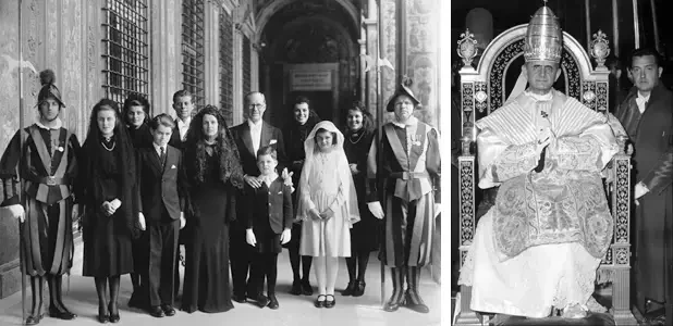 На фото слева: семья Кеннеди во главе с Джозефом П. Кеннеди (послом США в Великобритании) и его женой Роуз присутствовала на коронации Папы Пия XII в Ватикане, представляя президента Рузвельта. Сыновья Джон Ф. Кеннеди и Тед Кеннеди лично причащались от Папы. Это редкая честь, которая укрепила важную связь между семьей и новым понтификом на раннем этапе их отношений, что задокументировано в семейных альбомах и архивах. Источник: Newsday
