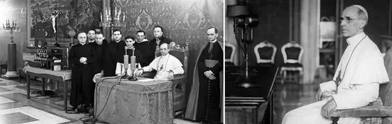 Папа Пий XII в окружении прелатов перед выступлением по радио. Пий XII был вторым в истории папой, выступающий с проповедями по радио. Источник: Getty Images