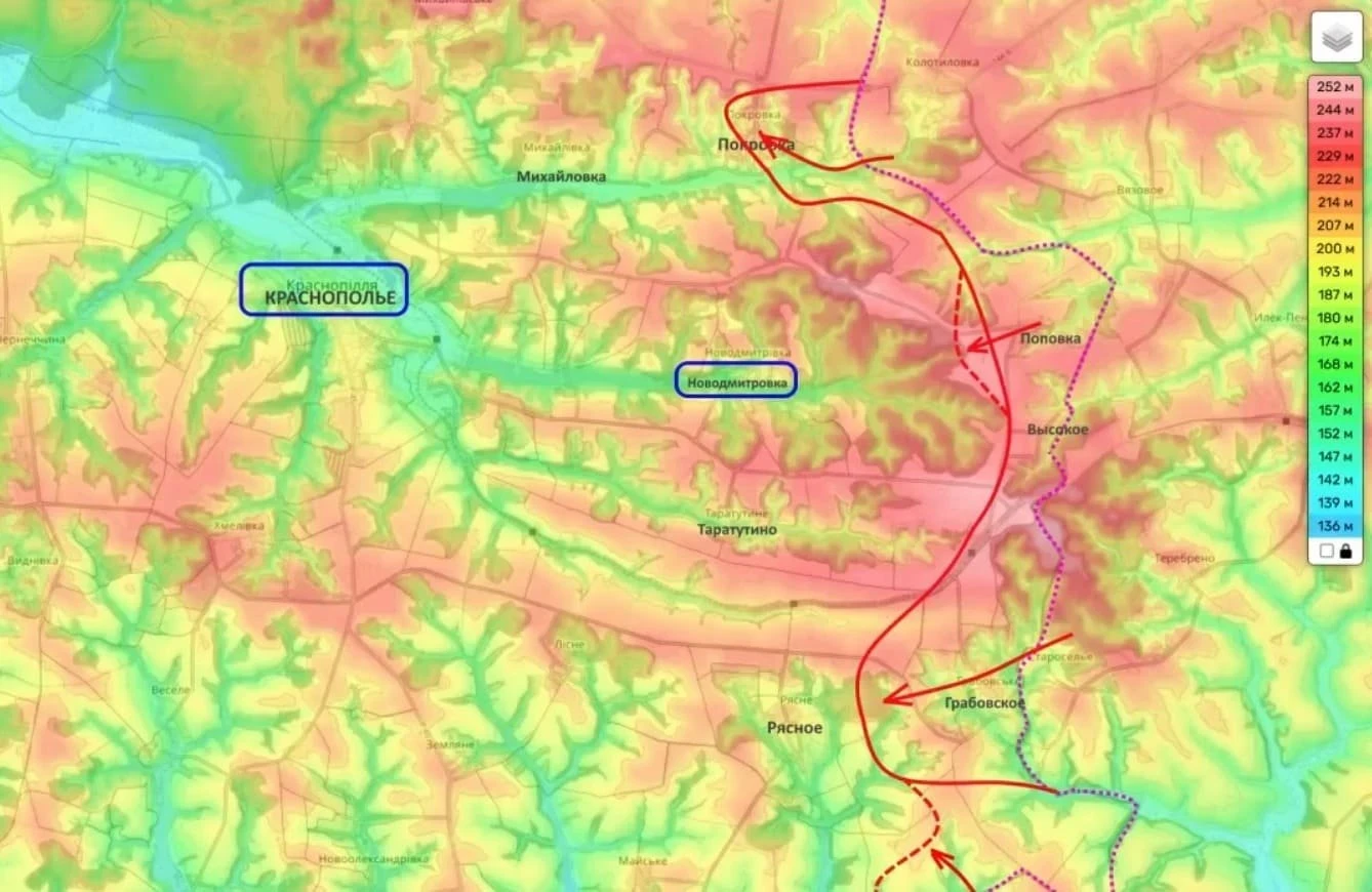 "В районе Краснополья наши подразделения продолжают системно наступать по направлению к Краснополью. Недавно были заняты населённые пункты Высокое и Грабовское. Сейчас идут бои в Покровке. Также сегодня наше командование заявило об освобождении небольшого хутора Поповка", - проинформировал Подоляка.