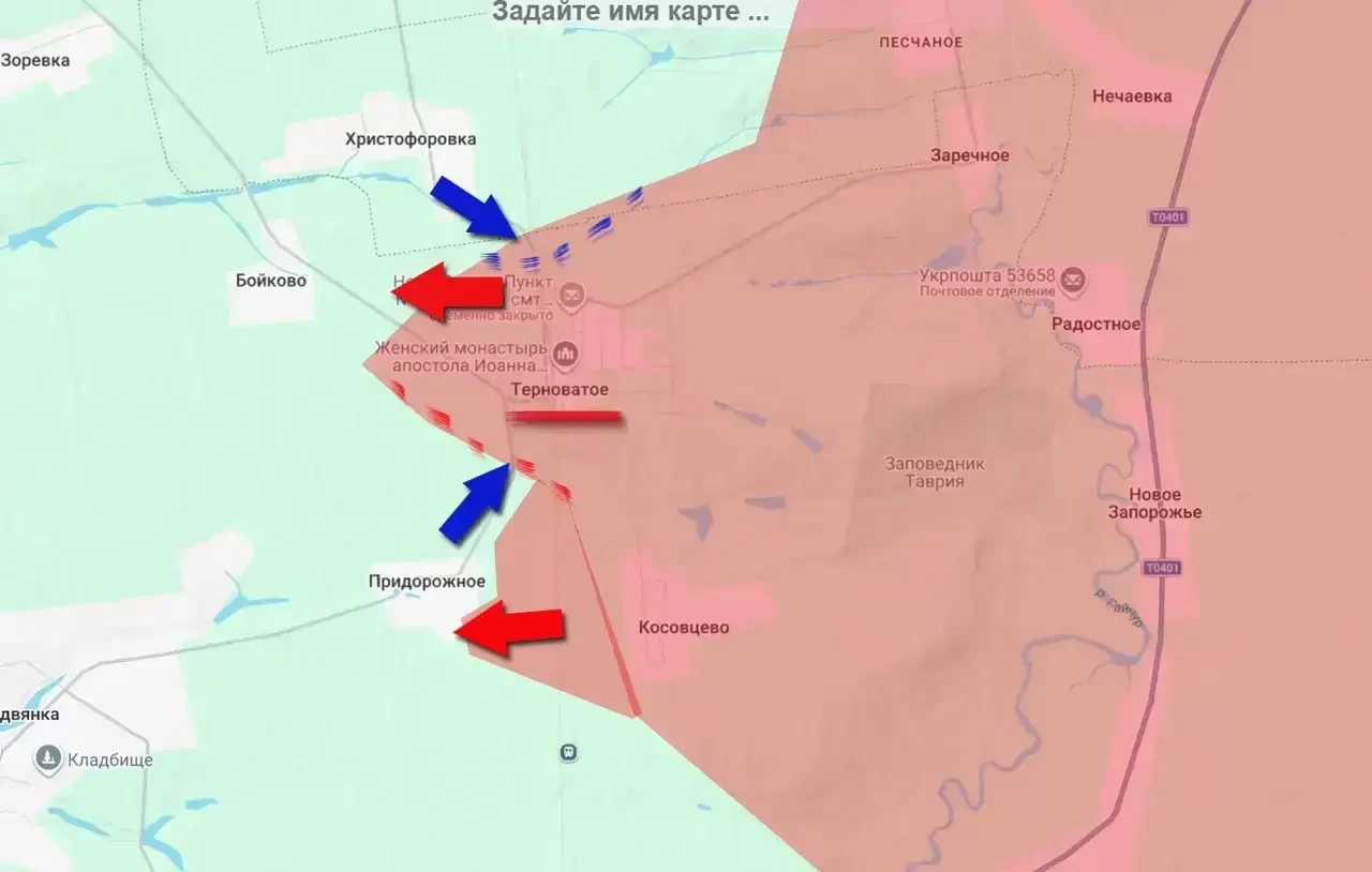 Активная фаза боёв идёт южнее населённого пункта Верхняя Терса. Сам он пока находится под контролем ВСУ. Противник бьёт из РСЗО со стороны Омельника и предпринимает попытки штурмов со стороны села Гуляйпольское. В свою очередь российские войска наносят контрудары к северо-западу от Зализничного, создавая давление на те позиции ВСУ, которые не были в достаточной степени укреплены после отступления остатков Гуляйпольского гарнизона украинских войск. Также по пытающемуся продвигаться к Гуляйполю противнику бьют дроноводы.
