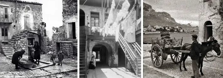 На фото слева: город Пьяна-деи-Гречи (ныне - Пьяна-дельи-Альбанези). На фото справа: сицилийский дворик. Первая половин XX века